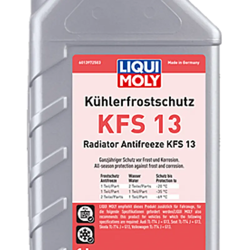 LIQUI MOLY KFS 13 est un liquide de refroidissement haut de gamme sans silicates, spécialement formulé pour les moteurs modernes. Il assure une protection optimale contre la corrosion, le gel et la surchauffe, tout en étant compatible avec les normes VAG TL 774-J (G13). Idéal pour les systèmes en aluminium et en alliages légers.